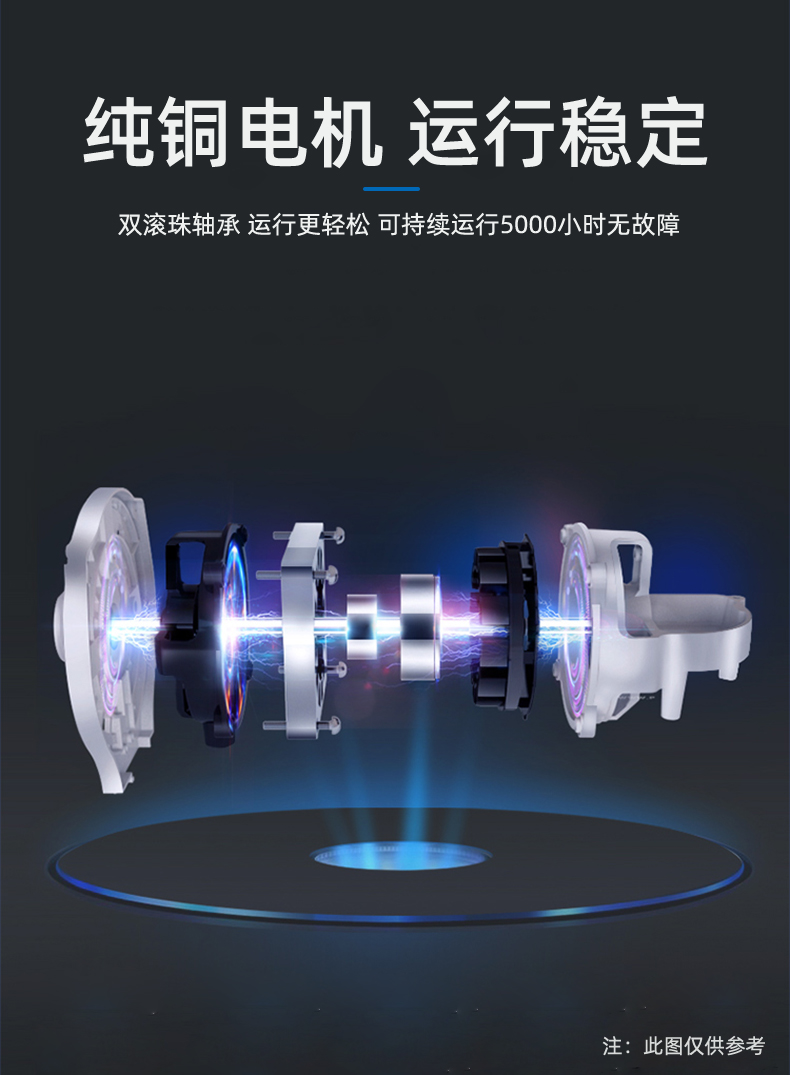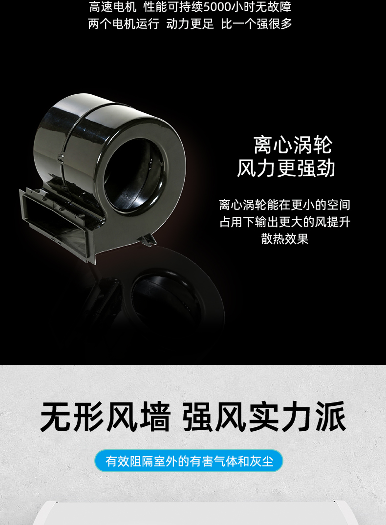 小機(jī)身大動力,采用離心蝸輪,高風(fēng)速更靜音。全新蝸殼斜導(dǎo)風(fēng)設(shè)計(實用新型專利:201721337682.0),減少出風(fēng)口盲點(diǎn),隔斷效果更出眾。高速純銅電機(jī),性能優(yōu)越,持續(xù)運(yùn)行8000小時以上無故障